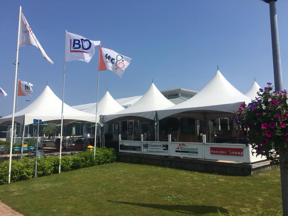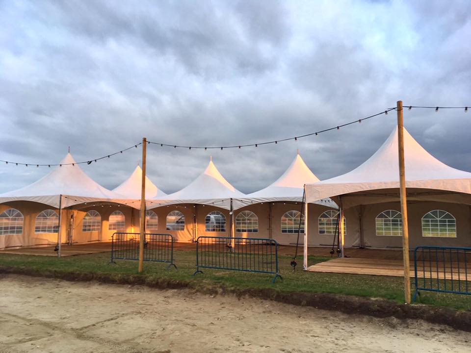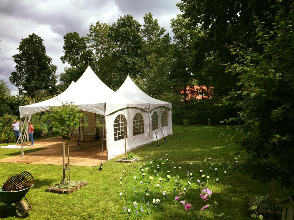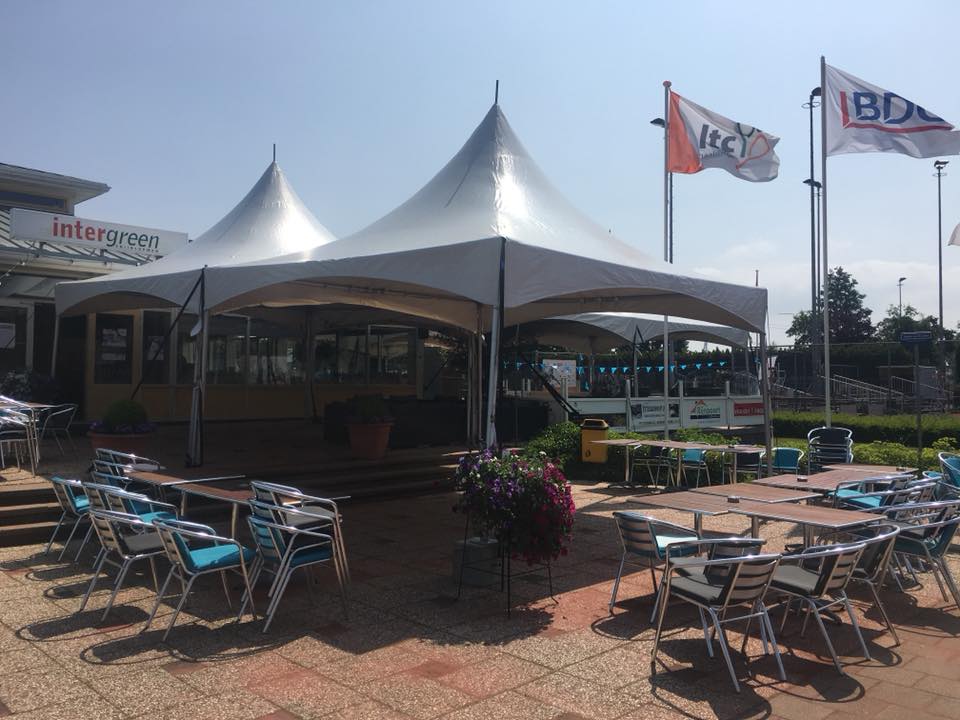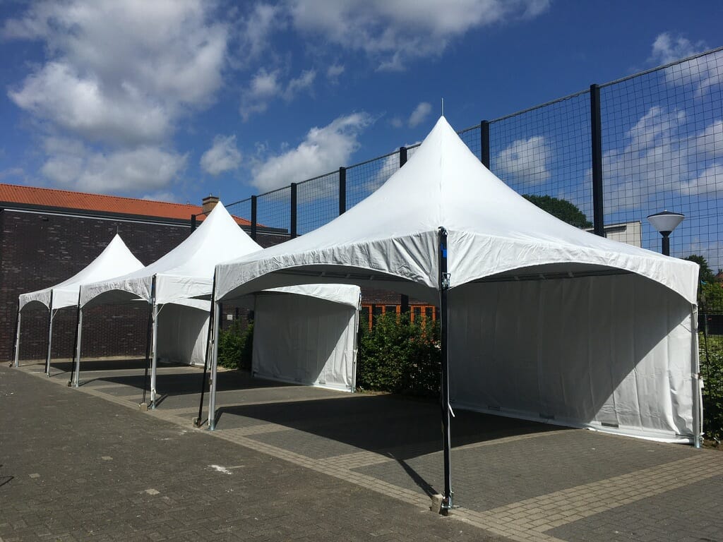 De topper onder de tenten. Een pagodetent, met name door zijn sierlijke, puntige dak, zorgt ervoor dat je gasten direct weten dat er iets te vieren valt of een mooi evenement te beleven is. Deze tent kan geschakeld worden aan andere pagodes, door middel van regengoten blijven je gasten dan ook droog. Zowel in een vierkant (met goot bij de vier middenpalen), naast elkaar, in een L- of U-vorm, maar net wat jouw evenement nodig heeft!