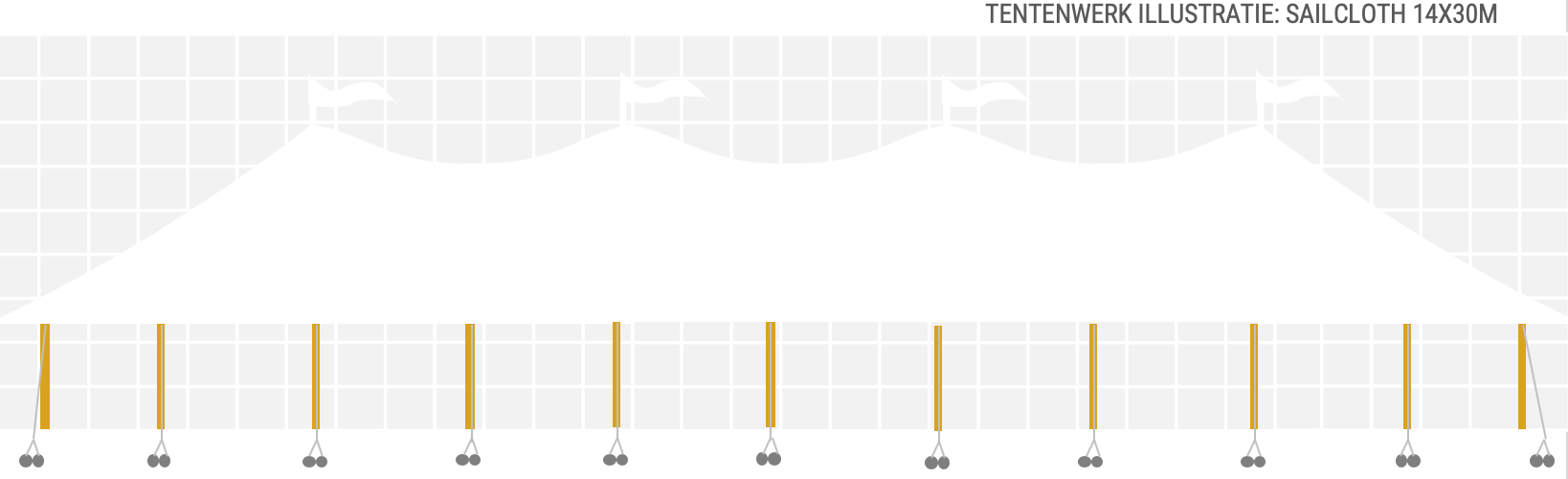 14x19m: 2 middenpalen, +/- 200 gasten (zittend), 224m2 oppervlakte, 254m2 vloer (optioneel), 18 zijwanden (optioneel)