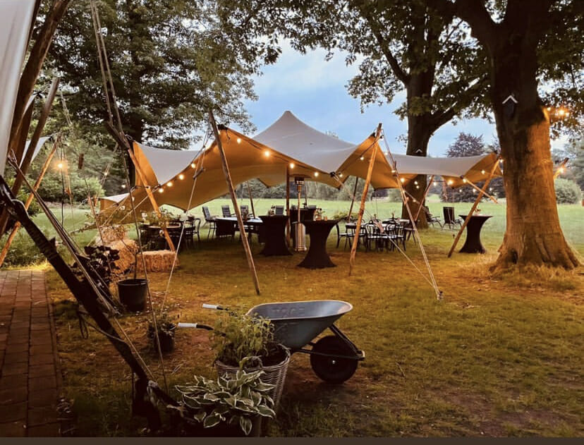 De tent is zandkleurig van buiten en crèmekleurig van binnen. De kastanjehouten palen en de scheerlijnen met eikenhout en touw geven de tent een festivalstijl. Met mooie aankleding (bijvoorbeeld met ons witte meubilair en lampionnen) kan de tent ook een chique uitstraling krijgen. Denk je ook aan een tentvloer, dansvloer, verlichting en of een podium?